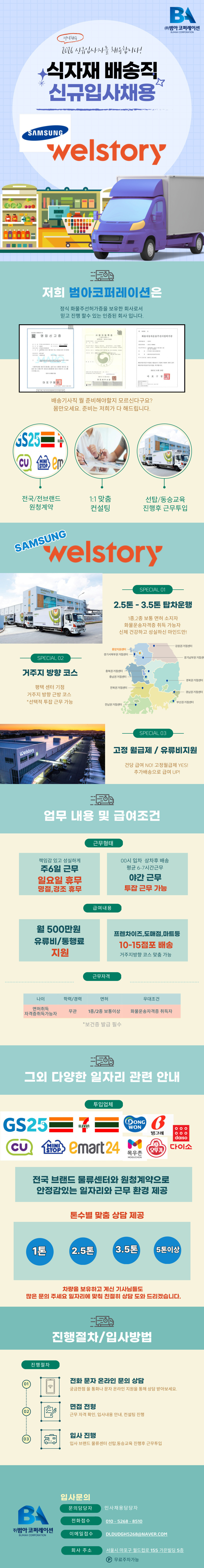 삼성웰스토리 2.5톤-3.5톤 저온차량 근무직 월500고정 야간근무